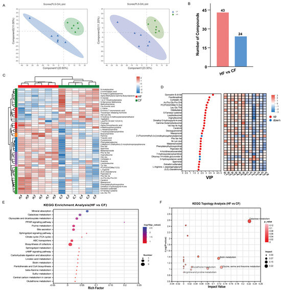 Metabolomic analysis of DEMs between HF and CF bulls. (A) PLS-DA score plots in positive (ESI+) and negative (ESI-) ionization modes. (B) Histogram showing counts of up- and downregulated DEMs between HF and CF groups. Pink bars represent up-regulated DEMs, and blue bars represent down-regulated DEMs. (C) Hierarchical clustering heatmap of DEMs between HF and CF groups. The color bar and numbers in the upper right corner represent the relative abundances of metabolites, with red indicating upregulated metabolites and blue indicating downregulated metabolites. (D) Top 30 DEMs ranked by VIP scores. The abscissa represents VIP values, while the ordinate shows the differential metabolites. Red and blue colors denote up- and downregulated metabolites, respectively. (E) KEGG pathway enrichment analysis of DEMs. The abscissa represents the rich factor and the ordinate displays the pathway names. Dot color indicates p-value (with red representing more significant enrichment), while dot size corresponds to number of metabolites involved in each pathway. (F) Pathway topological analysis plot. Dot color represents p-value and dot size indicates pathway impact.