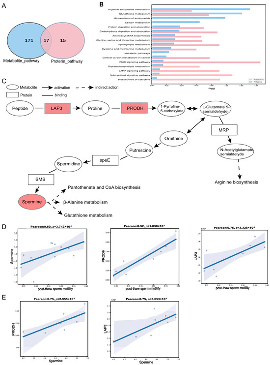 Integrated analysis of proteomic and metabolomic data. (A) Venn diagram showing the number of KEGG-enriched pathways for DEPs and DEMs, as well as the overlapping pathways. DEPs’ KEGG-enriched pathways are shown in blue; DEMs’ KEGG-enriched pathways are in pink. (B) Bar plot of co-enriched KEGG pathways for DEPs and DEMs. Blue bars represent proteins, and pink bars represent metabolites. (C) Network diagram of proteins and metabolites within the arginine and proline metabolism pathway. Circles represent metabolites, rectangles represent proteins, red circles indicate upregulated metabolites, red rectangles indicate upregulated proteins, white circles denote metabolites with no significant change in abundance, and white rectangles denote proteins with no significant change in expression. (D) Pearson correlation analysis between post-thaw sperm motility and spermine levels, PRODH expression, and LAP3 expression. (E) Pearson correlation analysis between spermine levels and expression of PRODH and LAP3.