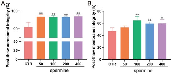 Effects of spermine supplementation on post-thaw sperm quality in bulls. (A) Acrosome integrity and (B) plasma membrane integrity of post-thaw sperm treated with varying concentrations of spermine. Data represent mean ± SD. ** p < 0.01, * p < 0.05 vs. CTR.