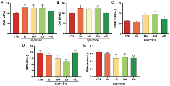 Effects of spermine supplementation in freezing medium on post-thaw bull sperm oxidative status. (A) Superoxide dismutase (SOD), (B) catalase (CAT), and (C) glutathione peroxidase (GSH-Px) activity; (D) reactive oxygen species (ROS) levels; and (E) malondialdehyde (MDA) levels. Data are presented as mean ± SD. ** p < 0.01, * p < 0.05 vs. CTR.
