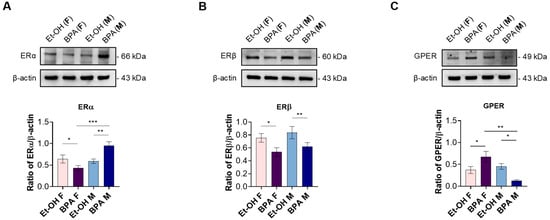 Effect of BPA on estrogen receptors (ER) and G protein-coupled estrogen receptor (GPER) in cardiac tissues. (A) Western blot analysis of ERα in the hearts of Et-OH female, BPA female, Et-OH male, and BPA male groups. Significant differences were detected by two-way ANOVA and Newman–Keuls multiple comparison test. * p < 0.05; ** p < 0.01; *** p < 0.001. (B) Western blot analysis of ERβ in the hearts of Et-OH female, BPA female, Et-OH male, and BPA male groups. Significant differences were detected by two-way ANOVA and Newman–Keuls multiple comparison test. * p < 0.05; ** p < 0.01. (C) Western blot analysis of GPER in the hearts of Et-OH female, BPA female, Et-OH male, and BPA male groups (n = 4 pulled). Histograms represent the ratio of densitometric analysis of protein:loading control. Data are expressed as the mean ± SEM (n = 3 independent experiments). Significant differences were detected by two-way ANOVA and Newman–Keuls multiple comparison test. * p < 0.05; ** p < 0.01.
