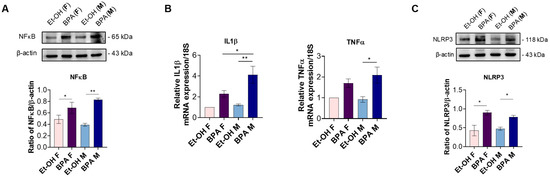 Given the role of the NLRP3 inflammasome multiprotein complex in amplifying inflammatory signaling and mediating IL-1β activation [39], we further assessed its protein expression levels through Western blot and relative densitometric analyses. Our results revealed a significant increase in NLRP3 expression in both sexes prenatally exposed to BPA compared to the control (Figure 2C).