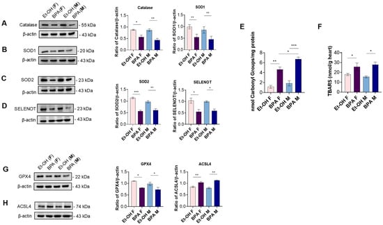 Effect of BPA on indicators of oxidative stress in cardiac tissues. (A) Western blot analysis of catalase in the hearts of Et-OH female, BPA female, Et-OH male, and BPA male groups (n = 4 pulled). Significant differences were detected by two-way ANOVA and Newman–Keuls multiple comparison test. * p < 0.05; ** p < 0.01 (B,C) Western blot analysis of SOD1 and SOD2 in the hearts of Et-OH female, BPA female, Et-OH male, and BPA male groups (n = 4 pulled). Significant differences were detected by two-way ANOVA and Newman–Keuls multiple comparison test. ** p < 0.01; *** p < 0.001. (D) Western blot analysis of SELENOT in the hearts of Et-OH female, BPA female, Et-OH male, and BPA male groups (n = 4 pulled). Histograms represent the ratio of densitometric analysis of protein:loading control. Significant differences were detected by two-way ANOVA and Newman–Keuls multiple comparison test. * p < 0.05. (E) Protein carbonyl groups in the hearts of Et-OH female, BPA female, Et-OH male, and BPA male groups (n = 4 pulled). Significant differences were detected by two-way ANOVA and Newman–Keuls multiple comparison test. * p < 0.05; ** p < 0.01; *** p < 0.001. (F) TBARS levels in the hearts of Et-OH female, BPA female, Et-OH male, and BPA male groups (n = 4 pulled). Significant differences were detected by two-way ANOVA and Newman–Keuls multiple comparison test. * p < 0.05. (G,H) Western blot analysis of GPX4 and ACSL4 in the hearts of Et-OH female, BPA female, Et-OH male, and BPA male groups (n = 4 pulled). Histograms represent the ratio of densitometric analysis of protein:loading control. Data are expressed as the mean ± SEM (n = 3 independent experiments). Significant differences were detected by two-way ANOVA and Newman–Keuls multiple comparison test. * p < 0.05; ** p < 0.01.