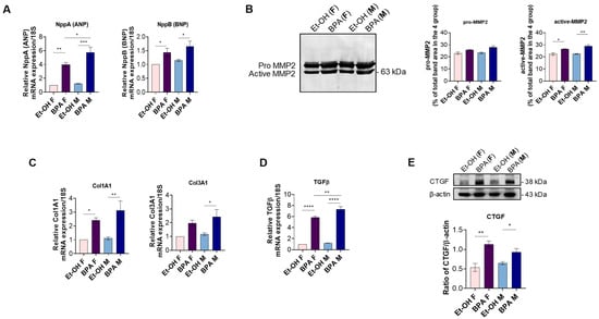 Effect of BPA on indicators of cardiac distension, remodeling, and fibrosis. (A) Evaluation of mRNA expression levels of NppA (ANP) and NppB (BNP) in Et-OH female, BPA female, Et-OH male, and BPA male groups (n = 4 pulled). Significant differences were detected by two-way ANOVA and Newman–Keuls multiple comparison test. * p < 0.05; ** p < 0.01; *** p < 0.001. (B) Gelatin SDS-PAGE zymographic analysis of MMP-2 activity in embryonic cardiac tissues in the hearts of Et-OH female, BPA female, Et-OH male, and BPA male groups (n = 4 pulled). Significant differences were detected by two-way ANOVA and Newman–Keuls multiple comparison test. * p < 0.05; ** p < 0.01 (C) Evaluation of mRNA expression levels of Col1A1 and Col3A1 in the hearts of Et-OH female, BPA female, Et-OH male, and BPA male groups (n = 4 pulled) Significant differences were detected by two-way ANOVA and Newman–Keuls multiple comparison test. * p < 0.05; ** p < 0.01 (D) mRNA expression levels of TGFβ in the hearts of Et-OH female, BPA female, Et-OH male, and BPA male groups (n = 4 pulled). Significant differences were detected by two-way ANOVA and Newman–Keuls multiple comparison test. ** p < 0.01; **** p < 0.0001. (E) Western blot analysis of CTGF in the hearts of Et-OH female, BPA female, Et-OH male, and BPA male groups (n = 4 pulled). Data are expressed as the mean ± SEM (n = 3 independent experiments). The relative mRNA expression levels were normalized to 18S rRNA. The fold change is calculated on the basis of 2−ΔΔCT. Histograms represent the ratio of densitometric analysis of protein:loading control. Significant differences were detected by two-way ANOVA and Newman–Keuls multiple comparison test. * p < 0.05; ** p < 0.01.