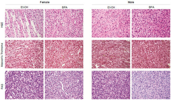 To determine whether prenatal BPA exposure induces structural and histopathological alterations in the fetal rat heart, we performed morphological analyses using H.E., Masson’s trichrome, and PAS staining (Figure 5).