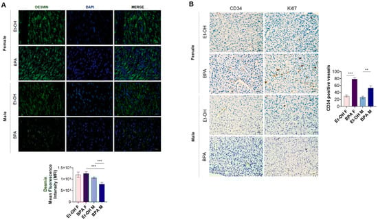 To further investigate the structural damage induced by BPA exposure, we first assessed the expression of desmin, a major component of the muscle intermediate filaments, playing a vital role in the maintenance of skeletal and cardiac cellular architecture and structure [46] in fetal cardiac tissues. The results showed a clear localization of desmin at the Z-discs of the sarcomeres in both male and female control hearts, while they highlighted a reduced expression of desmin, especially in the cardiac fibers of male hearts exposed to BPA (Figure 6A). Moreover, to evaluate potential vascular damage associated with BPA exposure, we analyzed the expression of CD34, a cell surface antigen expressed on endothelial cells, commonly used as a marker to identify and quantify blood vessels in altered tissues [47]. As shown in Figure 6B, CD34 expression was increased in the microvessels of both male and female hearts from the BPA-treated groups compared to their controls, with a more pronounced effect observed in females. Based on the BPA-induced increase in cellularity and vessels observed in morphological evaluation, we then evaluated the expression of Ki67, a marker of cellular proliferation [48]. The results showed that the same tissue foci reactive for CD34 were reactive for Ki67, particularly in the female hearts treated with BPA (Figure 6B).