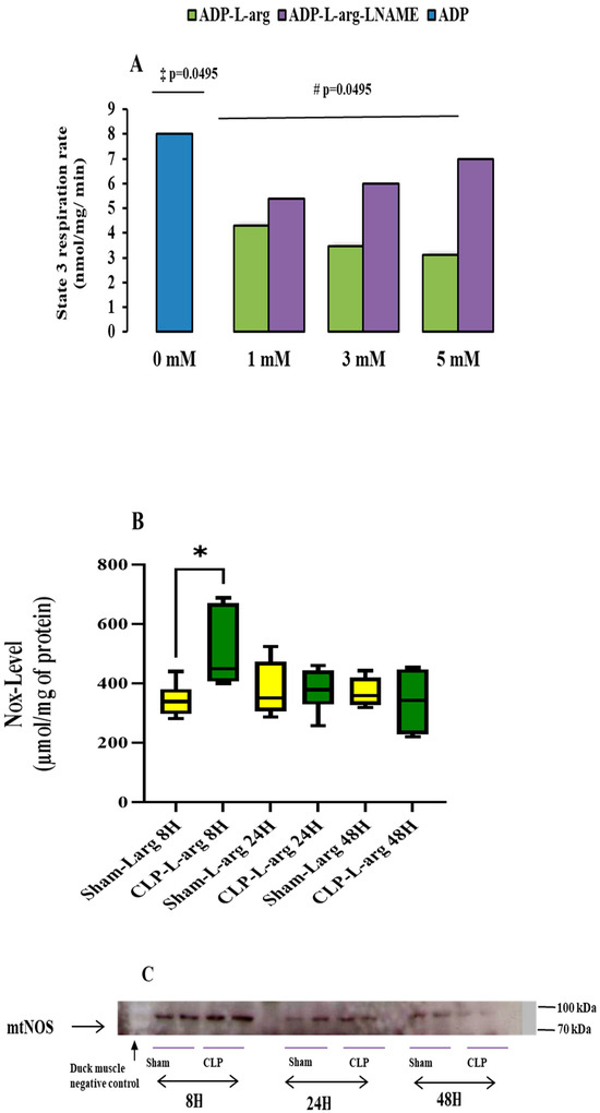 L-arg inhibited mitochondrial respiration, NO metabolites, and mtNOS content. (A). Respiration rates of liver mitochondria isolated from control mice in the presence of L-arg alone and L-arg plus L-NAME. Experiments were carried out in metabolic state 3 (0.5 mmol L−1 ADP) with energized mitochondria respiring on glutamate (5 mmol L−1) and malate (2.5 mmol L−1). Median (IQR) values for each group (n = 3 per group) are given in nmol O2/min/mg of protein: (ADP group) 8 [IQR 7–8], (ADP+ 1mM of L-arg) 4.3 [4–4.6], (ADP + 3 mM of L-arg) 3.45 [3.10–3.9], (ADP + 5 mM of L-arg) 3.10 [3–3.2], (ADP + 1 mM of L-arg + 1 mM L-NAME) 5.4 [5–5.8], (ADP + 3 mM of L-arg + 3 mM L-NAME) 6 [5.9–6.1], and (ADP + 5 mM of L-arg + 5 mM L-NAME) 7 [6–8.06]. Data are expressed as median (with 25th and 75th percentiles as noted above) from 3 independent measures in each group (n = 3). ‡ p = 0.0495 values are significantly different from ADP-L-arg groups; # p = 0.0495 values are significantly different from ADP-L-arg-L-NAME groups. Statistical comparisons between groups were performed using nonparametric Mann–Whitney test. (B) NOx-level determination by Griess reaction (see Section 2 Materials and Methods for details) in respiratory buffer containing mitochondria of CLP mice incubated with L-arg (orange box) and corresponding sham-operated mice (yellow box) after measurement of respiratory parameters, as described in Materials and Methods section. Data are expressed as median with 25th and 75th percentiles. Boxplots denote median and interquartile ranges, and whiskers denote min/max values from 5 animals per group (n = 5) in each following period (8, 24, and 48 h after onset of surgery). * p < 0.0037 values indicate higher levels of Nox- in CLP group compared to matching sham-operated group. Statistical comparisons between groups were performed using nonparametric Mann–Whitney test. (C) Western blot detection of mtNOS. Liver mitochondrial nitric oxide synthase was found to react with anti-NOS 2 [13]; we used primary antibodies of anti-mouse polyclonal anti-iNOS to identify mtNOS using Western blot standard techniques. Cold-acclimated Duck-muscle mitochondria were used as negative controls.