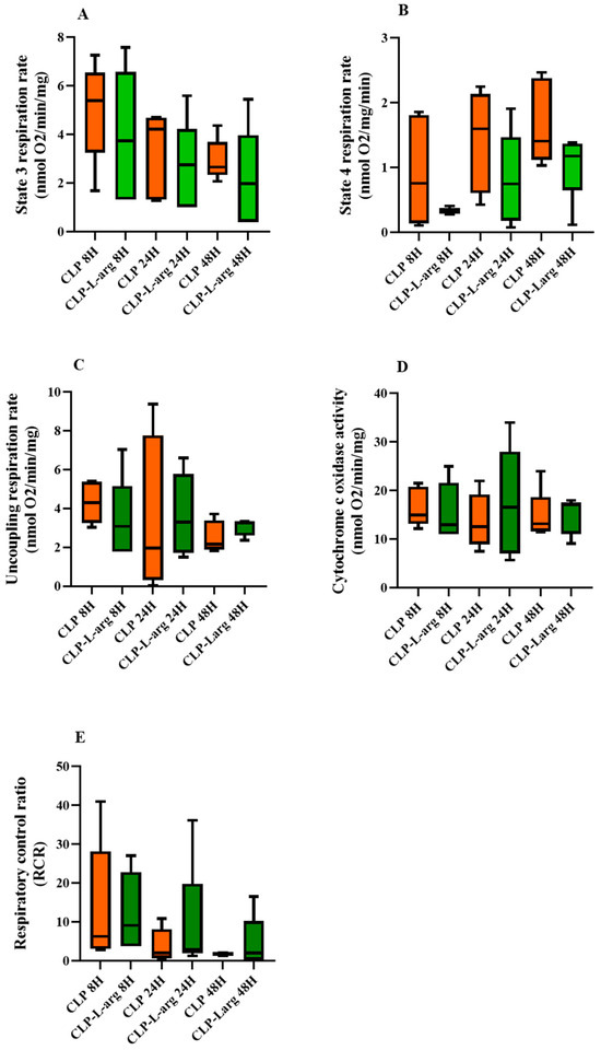 When we compared the mitochondrial respiration of CLP mice treated with L-arg with those untreated at the same end time point, we found that L-arg showed decreased mitochondrial respiratory parameters in CLP-treated mice compared to untreated. However, the difference did not reach statistical significance (Figure 3). Additionally, 48 h after CLP, the decrease in state 4 respiration was more significant than that in state 3 respiration (−39% versus–12%), but this greater decrease in state 4 respiration did not significantly increase the RCR (mitochondrial efficiency) of CLP-treated mice 2.11 [0.32–10.31] compared to the untreated mice 1.85 [1.54–2.10]). In other words, L-arg did not improve mitochondrial efficiency 48 h after CLP, contrary to what was expected (Table 2). Although it was not the focus of our study, we noted that L-arg decreased cytochrome c activity in the sham-operated mice (Table 1 and Table 2).