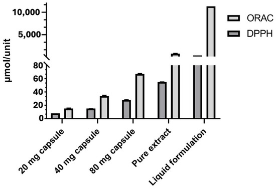 Comparison of antioxidant capacity determined by DPPH (using methanol as the solvent) and ORAC assays in different formulations of Zingiber officinale. Results are expressed as µmol TE per unit of consumption: per capsule, per 0.3 g of pure extract, or per 300 mL of liquid formulation. Error bars represent the standard deviation.