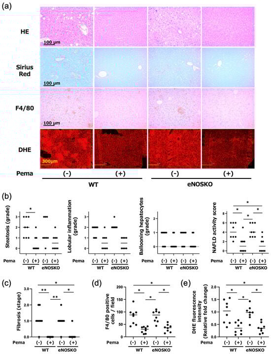 Representative histopathological findings of the liver are shown in Figure 2a. The assessment of each hepatic pathological finding, including steatosis, lobular inflammation and ballooning of hepatocytes, only showed significant difference in steatosis between WT mice with and without pemafibrate treatment. However, the NAFLD activity score, as a comprehensive index of MASLD, showed that pemafibrate treatment significantly reduced the scores in both WT and eNOSKO mouse groups compared to those in both vehicle treatment groups. The findings based on Sirius red staining demonstrated that pemafibrate treatment significantly reduced the areas of liver fibrosis in both WT and eNOSKO mouse groups compared to those in both vehicle treatment groups (Figure 2a,c).