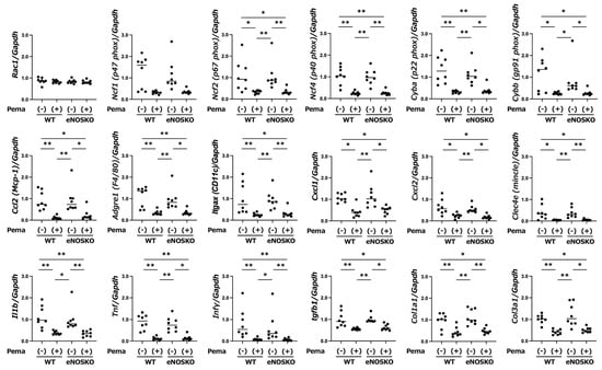 Since activation of the nicotinamide adenine dinucleotide phosphate (NADPH) oxidase system is a crucial source of superoxide production, we assessed the gene expression levels of NADPH oxidase subunits. As shown in Figure 3 and Figure S1, no significant alterations in expression levels were found in Rac1, Ncf1, Noxo1, Nox1 and Nox4 genes. However, the gene expression levels of Ncf2, Ncf4, Cyba and Cybb were significantly reduced in the pemafibrate-treated groups compared to those in the vehicle-treated groups in both WT mice and eNOSKO mice.