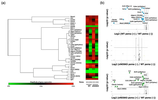 A whole-sample gene expression clustergram (Figure S2) and a group-wise integrated gene expression clustergram (Figure 4a) showed the summary of pemafibrate-induced alterations of gene expression profiles in WT mice and eNOSKO mice. The clustergrams revealed that pemafibrate suppressed the gene expression of NADPH oxidase subunits, M1 macrophages and their related factors, inflammatory cytokines and chemokines and profibrotic factors regardless of eNOS deficiency. As shown in Figure 4b, analyses of the volcano plots with reference to vehicle-treated WT mice showed that pemafibrate suppressed the MASLD-promoting genes in both WT mice and eNOSKO mice in a similar way.