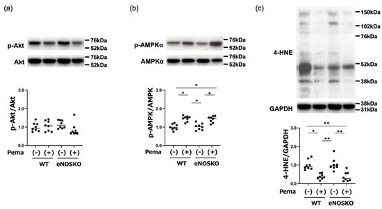 Since activation of the Akt and AMP-activated protein kinase (AMPK) signaling pathway has been shown to be associated with the development of MASLD [28], we examined those factors via Western blot analysis. As shown in Figure 5a, although Akt phosphorylation was not different among the mouse groups, AMPKα phosphorylation was significantly greater in the pemafibrate-treated groups than in the vehicle-treated groups regardless of eNOS deficiency (Figure 5b). Since lipid peroxidation produces 4-HNE, which has become widely accepted as a cause of oxidative stress, we estimated hepatic 4-HNE and found that 4-HNE levels were significantly lower in the pemafibrate-treated groups than those in the vehicle-treated groups regardless of eNOS deficiency (Figure 5c). These results are consistent with the results for DHE fluorescence intensities in this study.