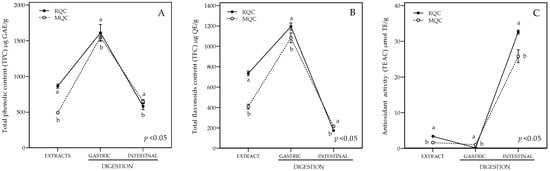 Results of the TPC, TFC, and antioxidant capacity are shown in Figure 1. Before gastrointestinal digestion, the RQC samples showed higher values of TPC (864.4 ± 28.4 µg GAE/g), TFC (735.3 ± 23.0 µg QE/g), and antioxidant activity (3.4 ± 0.1 µmol TE/g) as compared to the MQC samples (490.7 ± 10.7 µg GAE/g; 408.7 ± 12.9 µg QE/g and 1.7 ± 0.1 µmol TE/g, respectively). After the gastric phase, both the RQC and MQC samples increased their values of TPC (1610.8 ± 117.3 vs. 1551.0 ± 51.1 µg GAE/g) and TFC (1194.4 ± 36.0 vs. 1083.4 ± 47.9 µg QE/g), with the RQC sample having higher values than the MQC sample. After the intestinal phase, the values of TPC and TFC were notably decreased for the RQC and MQC samples (580.6 ± 47.7 vs. 647.9 ± 27.0 µg GAE/g for TPC and 173.5 ± 5.1 vs. 214.7 ± 6.8 µg QE/g for TFC); similar values were obtained before digestion. It is relevant to highlight that, in the intestinal phase, the MQC samples had higher values of TPC and TFC as compared with the RQC samples (p < 0.05). Antioxidant activity was considerably higher after the intestinal phase as compared to the gastric phase and before digestion. The RQC samples showed higher antioxidant activity than the MQC samples after this same phase.