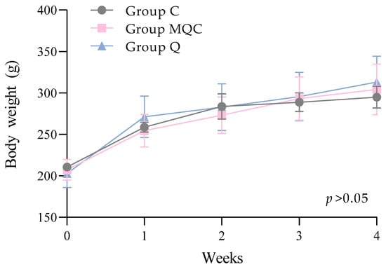 Body weight of the animals in the control, MQC, and Q groups. Data are expressed as the mean ± SE. p < 0.05 (Tukey test) compared to the control group.