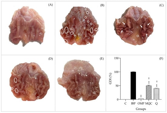 Effect of different treatments on macroscopic features of ibuprofen (IBP)-induced gastric injury in the stomachs of the experimental groups. Data are expressed as the mean ± SE. One-way analysis of variance was followed by the Tukey–Kramer post hoc test. Significance is represented as (‡) p < 0.05 as compared to the IBP group; (†) p < 0.05 as compared to the omeprazole group. (A) Control: basal diet (C), (B) ibuprofen (IBP), (C) omeprazole (OMP), (D) 20% microwave quinoa cookie (MQC), (E) 0.20% quercetin (Q), and (F) gastric damage index (%). Circles on figure indicate petechiae, and the arrows indicate bleeding/hemorrhage.
