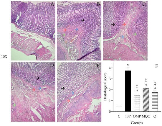 Effect of different treatments on ibuprofen (IBP)-induced gastric damage stained with hematoxylin and eosin (H&E, 10× light microscopy magnification) of the experimental groups. Data are expressed as the mean ± SE. Significance is represented as (*) p < 0.05 as compared to the control group; (‡) p < 0.05 as compared to the IBP group. One-way analysis of variance was followed by the Tukey–Kramer post hoc test. (A) Basal diet control (C), (B) ibuprofen (IBP), (C) omeprazole (OMP), (D) 20% microwave quinoa cookie (MQC), and (E) 0.20% standard quercetin (Q). (F) Histological score of gastric mucosal injury. Damaged gastric epithelium (→ black arrow), submucosa hemorrhage (→ green arrow), congested blood vessels (→ red arrow), and neutrophil infiltration (→ blue arrow).