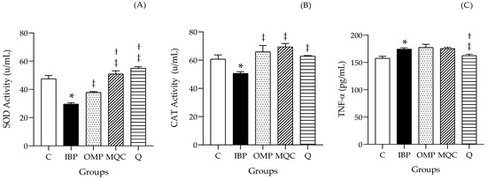 The results of the effect of enzymatic antioxidant activity on the plasma of rats fed different dietary treatments are shown in Figure 5. SOD (Figure 5A) and CAT (Figure 5B) activity was decreased in the IBP group as compared to the control group (p < 0.05). The MQC and Q groups showed an increase in SOD and CAT activities as compared with the IBP group, while the OMP group also showed an increase in enzymatic antioxidant activity as compared to the IBP group. Figure 5C shows the effect of different dietary treatments on the TNF-α concentration, where significant differences between the control group and the IBP group are apparent; thus, the generation of gastric damage in the model can be established. Of the treatments administered, only Group 5 (Q) showed a significant difference as compared to Group 2 (IBP).