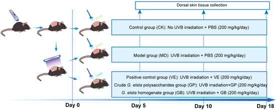 A UVB-induced acute skin damage model was established by incremental UVB exposure through an ultraviolet mutagenesis chamber (Model ZW-15, Shaoxing Zhicheng Instrument Co., Ltd., Zhejiang, China). Mice were anesthetized, depilated, and irradiated in a UV chamber at a distance of 15 cm from UVB lamps (two 15 W UVB lamps, λmax = 313 nm, irradiance 1.5 mW/cm2). The exposure lasted for three days, with durations of 50 s, 50 s, and 43.3 s, and a total exposure dose not exceeding 430 mJ/cm2 (Dose (mJ/cm2) = Intensity (mW/cm2) × Time (s)) [29,30]. Mice were randomized into five groups (n = 9/group) with the following treatments (Figure 1): control group (CK) without UVB exposure, treated with PBS (200 mg/kg/d); model group (MD) exposed to UVB, treated with PBS (200 mg/kg/d); positive control group (VE) exposed to UVB, treated with VE (200 mg/kg/d); G. elata homogenate group (GB) exposed to UVB, treated with G. elata homogenate (200 mg/kg/d); GP group exposed to UVB, treated with GP (200 mg/kg/d). Three mice per group were sacrificed on days 5, 10, and 18 for dorsal skin tissue collection (Figure 1). The samples were immediately flash-frozen in liquid nitrogen and stored at −80 °C for subsequent analysis.