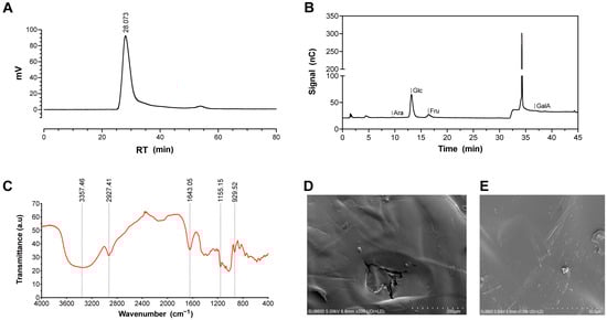 Structural characteristics of GP. (A) The result of the weight-average molecular weight of GP. (B) The result of monosaccharide composition of GP. (C) The FT-IR spectrum of GP. (D) SEM image (200×) of GP. (E) SEM image (1000×) of GP.