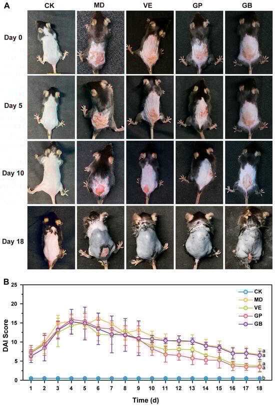 In vivo skin condition of mice. (A) The appearance of mice skin was observed via the naked eye on days 0, 5, 10, and 18. (B) DAI score of the dorsal skin in mice. Different letters indicate statistically significant differences (p < 0.05).