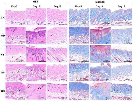 H&E staining (Figure 4) revealed that on day 5, compared to the CK group, the other four groups exhibited varying degrees of epidermal damage, including structural disorganization, indistinct boundaries, necrosis, and a substantial infiltration of lymphocytes and granulocytes. By day 10, the epidermis of the GP, VE, and GB groups became more intact, with well-defined layer structures, although some necrotic areas and minor lymphocyte and granulocyte infiltration persisted in the dermis and subcutaneous tissue. The MD group displayed hyperkeratosis, parakeratosis, localized epidermal thickening, mild basal cell proliferation, minor lymphocyte and granulocyte infiltration, and slight hemorrhage. By Day 18, the GP and VE groups exhibited complete and relatively thin epidermis, with neatly arranged collagen fibers in the dermis, well-distributed skin appendages (hair follicles and sebaceous glands), and minimal lymphocyte infiltration. In the GB group, a slight increase in fibrous connective tissue proliferation was observed in the superficial dermis, with mild granulocyte and lymphocyte infiltration in the dermis and subcutaneous tissue. The MD group still showed areas of parakeratosis, uneven epidermal thickness, minor lymphocyte infiltration, neovascular congestion, slight hemorrhage, and a reduced number of skin appendages, with some follicles containing keratin plugs.