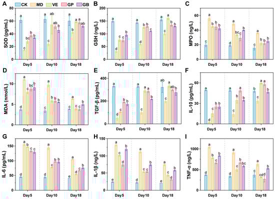 Effects of GP intervention on various biochemical indexes in the dorsal skin of mice. Expression of SOD (A), GSH (B), MPO (C), MDA (D), TGF-β (E), IL-10 (F), IL-6 (G), IL-1β (H), TNF-α (I). Different lower letters indicate significant differences among the groups (p < 0.05).