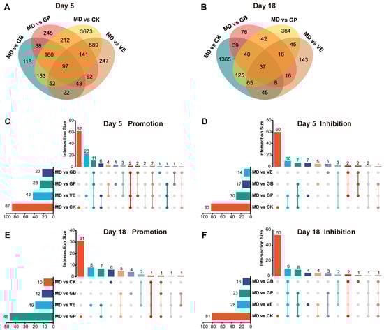 Additionally, Venn diagram analysis of DEGs (Figure 6A,B) showed that on Day 5, the largest number of shared genes was found between MD vs. CK and MD vs. VE (879 genes), followed by MD vs. GP (610 genes), MD vs. GB (462 genes). Moreover, MD vs. GP shared more genes with MD vs. VE (343 genes) than with MD vs. GB (214 genes). On Day 18, the number of shared genes between MD vs. GP and MD vs. CK (267 genes) was greater than that between MD vs. VE (155 genes). These results suggest that, compared to the GB group, the GP group exhibited greater gene expression similarity to the CK and VE groups.