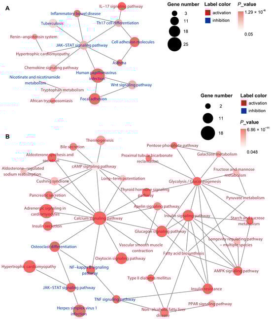 Enrichment network analysis of key KEGG pathways on Day 5 (A) and Day 18 (B).