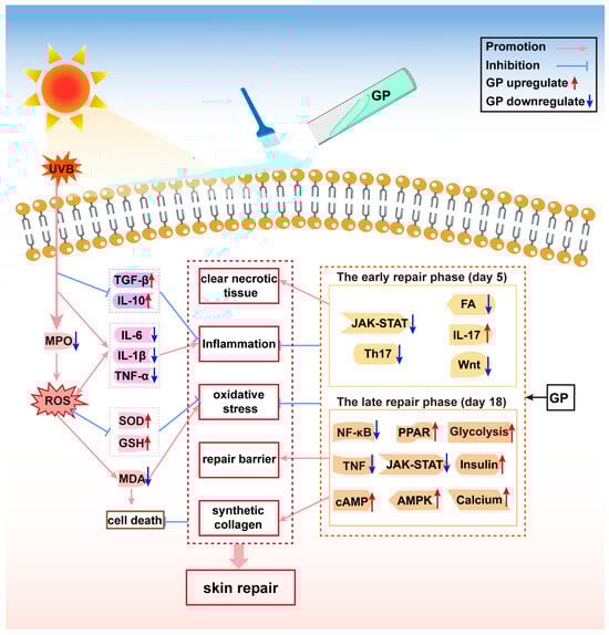 In conclusion, our findings suggest that GP mitigates UVB-induced acute skin damage through a series of antioxidative, anti-inflammatory, energy metabolism, cell migration, and proliferation mechanisms. These mechanisms are coordinated through key pathway networks, including the JAK-STAT signaling pathways, the calcium signaling pathways, and so on (Figure 8). This protective mechanism operates through three synergistic axes: (1) GP restores SOD/GSH expression, suppresses excessive ROS production, and alleviates oxidative damage; (2) GP downregulates pro-inflammatory cytokines (TNF-α, IL-1β, IL-6) while restoring anti-inflammatory mediators (TGF-β, IL-10), effectively alleviating skin inflammation; (3) GP facilitates the clearance of necrotic tissue, promotes collagen synthesis, and accelerates skin barrier repair. By orchestrating these responses, GP achieves comprehensive repair of UVB-induced acute skin damage, demonstrating its potential as a multi-target therapeutic agent and offering novel strategies for developing safe and effective skin protectants.