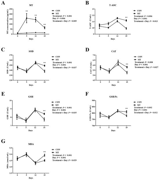 The effects of MT implantation on serum concentrations of MT were examined. As shown in Figure 2A, a marked increase in serum MT levels was observed in the MT group on Day 5 and Day 12. Although it decreased on Day 19, the MT level in the MT group was still significantly higher than that in the CON group (p < 0.01). The blood samples were also used to detect serum antioxidant related indicators. The results are shown in Figure 2B–G. On Day 0, Day 5 and Day 12, no statistically significant variations were observed in serum levels of T-AOC, SOD, CAT, GSH, and GSH-Px, or MDA between the MT and CON groups (p > 0.05). However, on Day 19, the levels of T-AOC, SOD, CAT, GSH, and GSH-Px in the MT group were significantly higher (p < 0.01), but the MDA content was significantly lower (p < 0.01), than those in the CON group. These findings suggested that an MT implantation had the potential to enhance the serum antioxidant capacity of ewes.