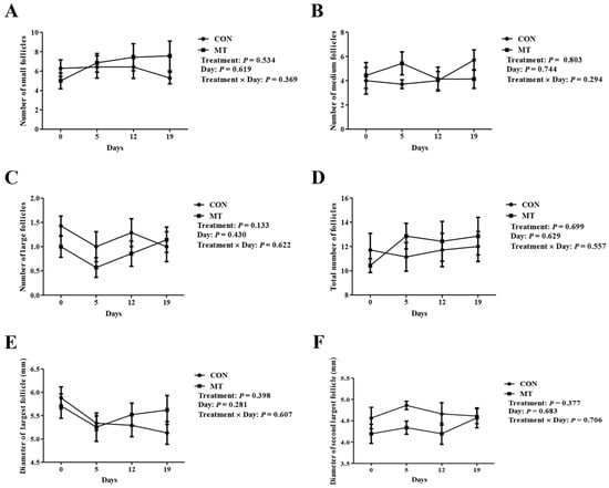 To assess the impact of MT implantation on follicle growth, the number and diameter of follicles on the ovaries were detected and counted at several key time points. As depicted in Figure 3A–F, MT treatment did not alter follicle population dynamics, including counts of small, medium, or large follicles, total number of follicles, and the diameters of the two largest follicles. These results indicated that MT treatment had no significant effects on the number of developing follicles (number of follicles above 2 mm) and follicle diameter (maximum and second largest follicle diameter).