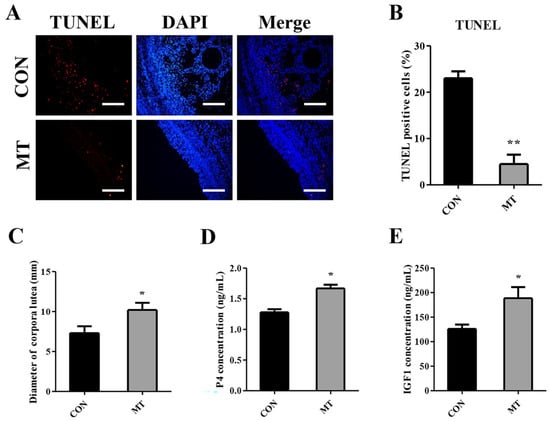 Effects of melatonin on the anti-apoptosis of ovaries and development of corpus luteum. CON group: FGA (45 mg) sponge for 14 days + 330 IU eCG at sponge withdrawal. MT group: Following 5 days of MT implantation, the same protocol as the CON group was applied. (A,B) Representative images and quantified results of TUNEL (n = 3). Scale bars = 50 μm. (C) Diameter of CL 8 days after estrus (n = 10). (D) The serum P4 concentration 8 days after estrus (n = 10). (E) The serum IGF-1 concentration 8 days after estrus (n = 10). Results are expressed as Mean ± SEM. * p < 0.05; ** p < 0.01.