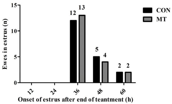 To examine the effects of MT implantation on estrus synchrony, the distribution of estrus onset time was counted. The estrus onset of both groups was mainly synchronized at 36 h after sponge withdrawal, followed by 48 h after sponge withdrawal (Figure 5). Implantation of MT had no significant effects on estrus synchrony.