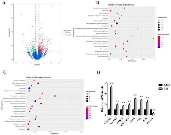 Effects of melatonin on the transcriptome of ovaries. CON group: FGA (45 mg) sponge for 14 days + 330 IU eCG at sponge withdrawal. MT group: Following 5 days of MT implantation, the same protocol as the CON group was applied. (A) Volcano plots of DEGs in the ovaries in the MT group vs. CON group. Upregulated genes are shown in red (p < 0.05), downregulated genes are shown in green (p < 0.05), and genes with no significant difference in expression are indicated in blue (p > 0.05). (B,C) KEGG enrichment analysis of upregulated and downregulated DEGs. The 20 most significantly enriched pathways are shown. (D) The 8 DEGs (GSTM1, KCNK3, PARP3, ADCYAP1, STAR, FOS, JUN, and FASLG) were validated by qRT-PCR. ** p < 0.01.