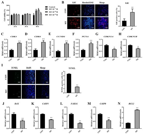 Effects of melatonin on cell proliferation and apoptosis of granulosa cells. CON group: Untreated. MT group: Cells were treated with 10−8 M MT in serum-free medium for 48 h. (A) The cell viability was determined by the CCK8 assay. (B) Representative images and quantified results of EdU. Scale bars = 50 μm. (C–H) The mRNA expression levels of CDK4, CDK6, CCND1, PCNA, CDKN1A, and CDKN1B were determined by qRT-PCR. (I) Representative images and quantified results of TUNEL. Scale bars = 50 μm. (J–N) The mRNA expression levels of BAX, CASP3, FASLG, CASP8, and BCL2 were determined by qRT-PCR. Results are expressed as Mean ± SEM (n = 3). Within each time point, groups with different lowercase letters indicate statistically significant differences (p < 0.05); * p < 0.05; ** p < 0.01.