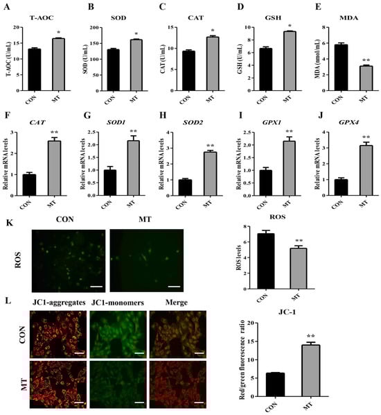 The supernatants of GC- and LC-cultured medium were collected to detect the antioxidant index. MT markedly enhanced the activities of T-AOC, SOD, CAT, and GSH content, but decreased the levels of MDA compared to the CON group (Figure 8A–E, Figure S3A–E). MT also significantly elevated mRNA abundance of CAT, SOD1, SOD2, GPX1, and GPX4 in GCs and LCs (Figure 8F–J, Figure S3F–J).
