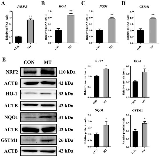 Effects of melatonin on NRF2 signaling pathway in granulosa cells. CON group: Untreated. MT group: Cells were treated with 10−8 M MT in serum-free medium for 48 h. (A–D) The mRNA expression levels of NRF2, HO-1, NQO1, and GSTM1 were determined by qRT-PCR. (E) The protein expression levels of NRF2, HO-1, NQO1, and GSTM1 were determined by the Western blot analysis. Results are expressed as Mean ± SEM (n = 3). * p < 0.05; ** p < 0.01.
