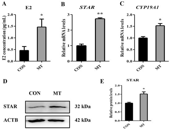 In the transcriptome data, steroidogenesis acute regulatory protein (STAR) gene was significantly upregulated in the MT group. STAR is responsible for the transport of cholesterol, the prerequisite for steroid hormone synthesis, from the mitochondrial outer membrane to the mitochondrial inner membrane, which is the rate-limiting step of steroid hormone synthesis [35]. With the aim to verify the promoting roles of MT on steroidogenesis of GCs and LCs, the supernatant of GC or CL culture medium was collected and concentrations of E2 and P4 was detected. It was found that MT significantly promoted the secretion levels of E2 in GCs (Figure 10A). qRT-PCR analysis revealed that the mRNA expression levels of STAR and CYP19A1 were significantly upregulated in the MT group compared to the CON group (Figure 10B,C). Additionally, the Western blot assay revealed that the MT group exhibited a higher protein expression level of STAR than the CON group (Figure 10D,E). In LCs, MT markedly improved the secretion levels of P4 (Figure S5A). The expression of STAR, CYP11A1, and HSD3B1 were elevated in the MT group compared to the CON group (Figure S5B–E). Overall, the above findings proved that MT could improve steroidogenic competence of GCs and LCs in vitro.