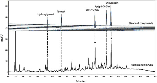 The determination of HT, lut-7-o-glu, apig-4-o-glu, and oleur in the olive leaf extract was performed following the analytical method proposed by the IOC, in accordance with the conditions described in the IOC/T.20/Doc No 29 method [46]. Separation of components was achieved using a reversed phase Discovery® HS C18 column (250 × 4.6 mm, 5 µm particle size). The mobile phase consisted of 0.2% v/v aqueous orthophosphoric acid (solvent A) and a methanol/acetonitrile mixture (50:50 v/v) as solvent B. Chromatographic separation was carried out at ambient temperature with a flow rate of 1.0 mL/min and an injection volume of 20 µL.