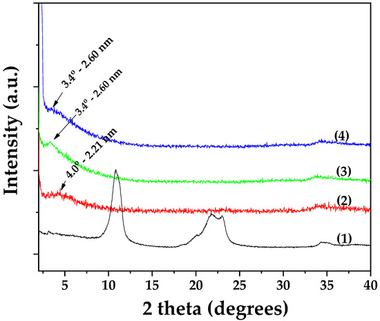 Figure 2 presents the XRD patterns of all synthesized OLE@LDH_Zn/Al_x/1 nanohybrids, alongside that of pure LDH_NaNO3_Zn/Al for comparison. As shown and consistent with previous studies, the characteristic (003) reflection of pure LDH_NaNO3_Zn/Al (plot line 1) appears at approximately 10°, corresponding to a basal spacing of 0.83 nm [49,50]. In the XRD patterns of the OLE@LDH_Zn/Al_x/1 nanohybrids, a broad peak observed around 5° indicates a shift of the (003) reflection to lower angles. Specifically, the basal spacing increases to 2.21 nm for OLE@LDH_Zn/Al_1/1 (plot line 2) and to 2.6 nm for both OLE@LDH_Zn/Al_2/1 (plot line 3) and OLE@LDH_Zn/Al_3/1 (plot line 4). This variation in basal spacing among the nanohybrids suggests differences in the orientation of the intercalated OLE molecules within the LDH interlayers, rather than differences in the amount of OLE adsorbed [51,52]. Among the three formulations, OLE@LDH_Zn/Al_2/1 exhibits the most intense (003) reflection, indicating superior platelet orientation. Overall, the XRD results confirm the successful intercalation of OLE molecules into the interlayer space of the LDH structure.