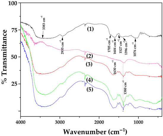 The FTIR spectrum of pure OLE (plot line 1) displays several absorption peaks, reflecting its complex chemical composition. The peak at 3383 cm−1 can be attributed to the N–H stretching vibration of amino groups and also indicates the presence of a bonded hydroxyl (–OH) group [53]. The absorption peak at 2935 cm−1 corresponds to –CH stretching vibrations of both –CH3 and –CH2 functional groups [53,54,55,56]. The shoulder peak at 1705 cm−1 is assigned to the C=O stretching vibration of carboxylic acids. These two prominent bands at 3383 and 1705 cm−1 are characteristic of the O–H and C=O stretching modes, potentially originating from compounds such as οleur, apig-4-o-glu, and/or lut-7-ο-glu [53,54,57,58]. The peak at 1604 cm−1 lies within the fingerprint region and is associated with the presence of CO, C–O, and O–H functional groups found in OLE [4]. Specifically, it can be attributed to C–O stretching in carboxyl groups coupled with the amide I linkage. The band at 1527 cm−1, characteristic of amide II, arises from N–H stretching modes in the amide linkage [59]. The peak at 1396 cm−1 is attributed to methylene scissoring vibrations associated with protein content. A strong band at 1076 cm−1 is assigned to C–N stretching vibrations of aliphatic amines or C–OH vibrations in proteins derived from olive leaves [53,54,57,58,60].
