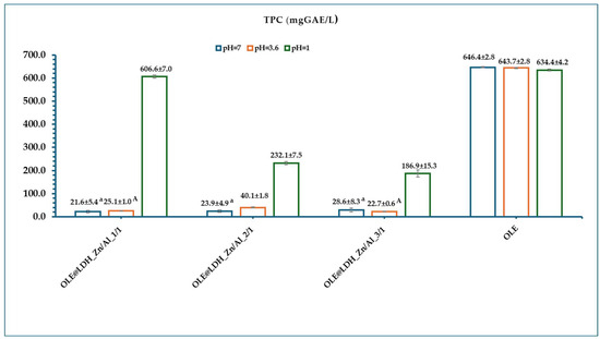 Calculated mean TPC values of all obtained OLE@LDH_Zn/Al_x/1 nanohybrids in pH = 7, 3.6, and 1, as well as pure OLE. Different letters (a, A) in each bar indicate statistically significant differences at a confidence level of p < 0.05. See also Table S7 in the Supplementary Material File.