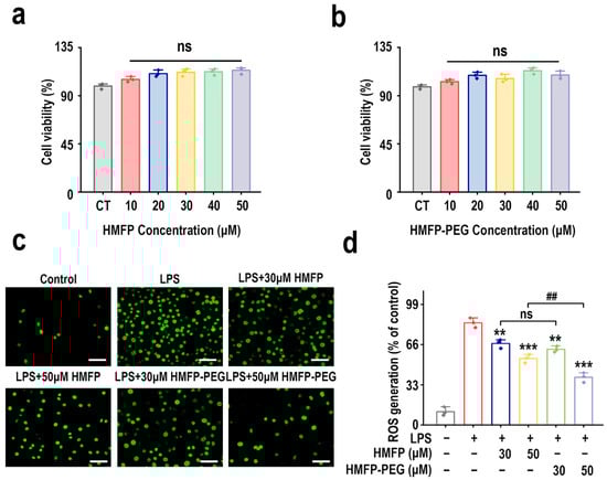 Reactive oxygen species (ROS) are key mediators in inflammatory responses, and anti-inflammatory activity is often achieved by inhibiting ROS production or facilitating ROS clearance [19,20,21]. To evaluate the anti-inflammatory potential of HMFP and HMFP-PEG, we used the DCFH-DA fluorescence probe to detect their effects on LPS-induced ROS generation in RAW264.7 cells. The experimental results show that LPS stimulation markedly elevated intracellular ROS levels, whereas pretreatment with both HMFP and HMFP-PEG effectively inhibited the excessive ROS release in a concentration-dependent manner (Figure 1c,d). Notably, at a concentration of 50 μM, HMFP-PEG revealed a stronger ROS suppression ability compared to HMFP, indicating that HMFP-PEG may exhibit superior anti-inflammatory effects.