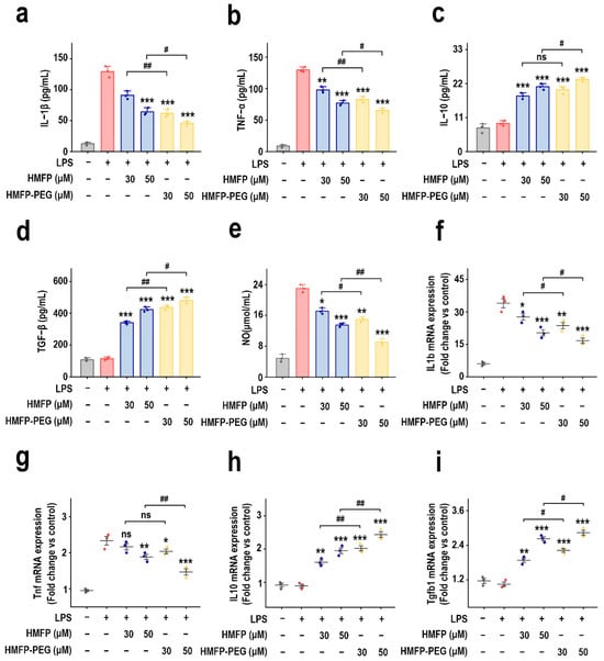 Effects of HMFP and HMFP-PEG on inflammatory cytokine secretion levels in RAW264.7 macrophages, including IL-1β (a), TNF-α (b), IL-10 (c), and TGF-β (d), as well as the NO production (e) and mRNA expression levels of IL1b (f), Tnf (g), IL10 (h), and Tgfb1 (i). *, **, and *** indicate p < 0.05, p < 0.01, and p < 0.001 compared to the model group, respectively. #, and ## represent significant differences between the two groups with p < 0.05, and p < 0.01, respectively; ns indicates no significant difference.