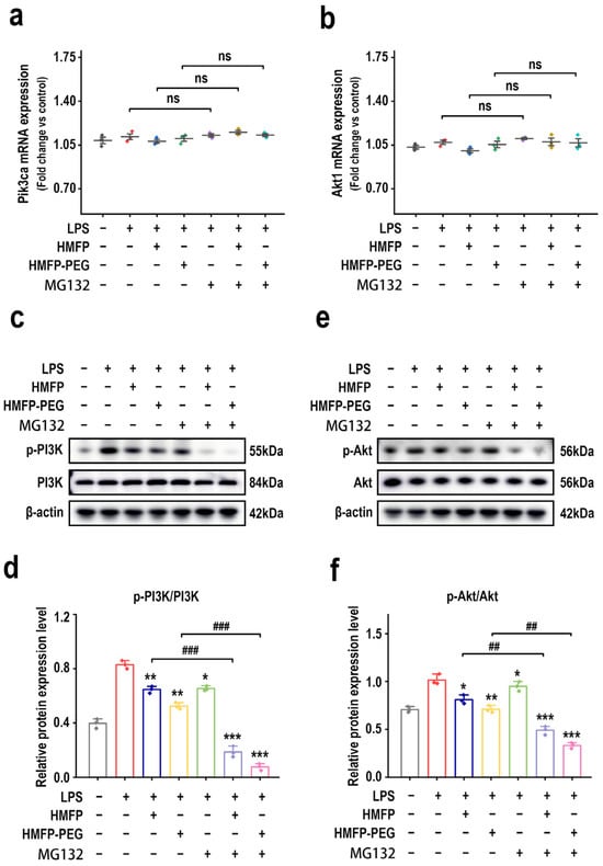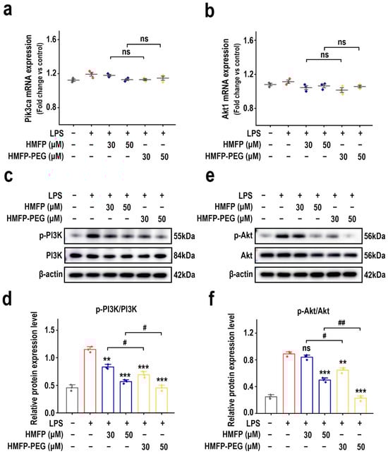 The PI3K-Akt signaling pathway plays a crucial role in regulating immune and inflammatory responses [22,23,24]. Its activation induces the production of pro-inflammatory factors and promotes macrophage polarization toward the M1 phenotype, thereby exacerbating the inflammatory response [25,26,27]. To further investigate whether the anti-inflammatory mechanism of HMFP and its derivative HMFP-PEG is related to the PI3K-Akt signaling pathway, we first examined the mRNA expression levels of Pik3ca and Akt1, the genes encoding PI3K and Akt, respectively. RT-qPCR results show that, after LPS induction, there was no significant difference in the mRNA levels of Pik3ca and Akt1 compared to the control group, and no obvious changes were observed among the treatment groups, indicating stable transcriptional levels (Figure 3a,b).