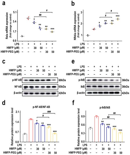 Effects of HMFP and HMFP-PEG on the NF-κB signaling pathway in macrophages. (a,b) Analysis of mRNA expression levels of Rela and Nfkbia. (c,d) Western blot analysis and quantification of NF-κB and phosphorylated NF-κB (p-NF-κB) protein expression. (e,f) Western blot analysis and quantification of IκB and phosphorylated IκB (p-IκB) protein expression. *, **, and *** indicate p < 0.05, p < 0.01, and p < 0.001 compared to the model group, respectively. #, ##, and ### represent significant differences between the two groups with p < 0.05, p < 0.01, and p < 0.001, respectively; ns indicates no significant difference.