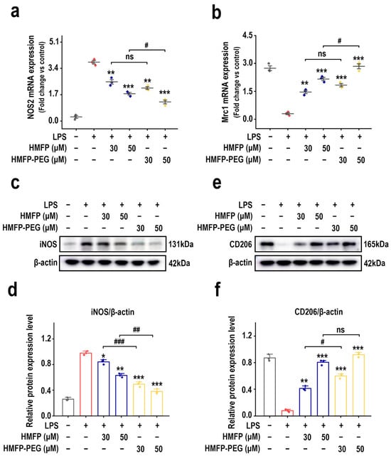 Regulatory effects of HMFP and HMFP-PEG on macrophage polarization. (a,b) Analysis of mRNA expression levels of NOS2 and Mrc1. (c,d) Western blot analysis and quantification of iNOS protein expression. (e,f) Western blot analysis and quantification of CD206 protein expression. *, **, and *** indicate p < 0.05, p < 0.01, and p < 0.001 compared to the model group, respectively. #, ##, and ### represent significant differences between the two groups with p < 0.05, p < 0.01, and p < 0.001, respectively; ns indicates no significant difference.