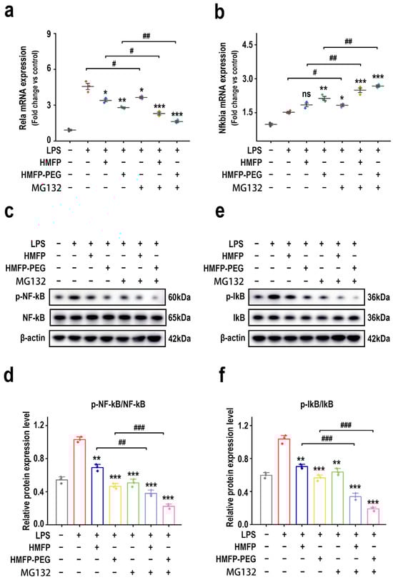 Effects of HMFP and HMFP-PEG on the NF-κB signaling pathway in macrophages after MG132 treatment. (a,b) Analysis of mRNA expression levels of Rela and Nfkbia. (c,d) Western blot analysis and quantification of NF-κB and p-NF-κB protein expression. (e,f) Western blot analysis and quantification of IκB and p-IκB protein expression. *, **, and *** indicate p < 0.05, p < 0.01, and p < 0.001 compared to the model group, respectively. #, ##, and ### represent significant differences between the two groups with p < 0.05, p < 0.01, and p < 0.001, respectively; ns indicates no significant difference.