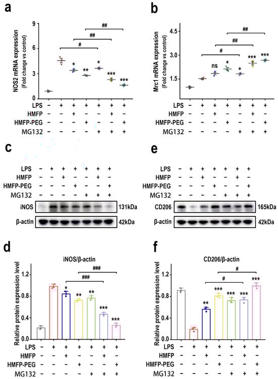 Effects of HMFP and HMFP-PEG on macrophage polarization after MG132 treatment. (a,b) Analysis of the mRNA expression levels of NOS2 and Mrc1. (c,d) Western blot analysis and quantification of iNOS protein expression. (e,f) Western blot analysis and quantification of CD206 protein expression. *, **, and *** indicate p < 0.05, p < 0.01, and p < 0.001 compared to the model group, respectively. #, ##, and ### represent significant differences between the two groups with p < 0.05, p < 0.01, and p < 0.001, respectively; ns indicates no significant difference.
